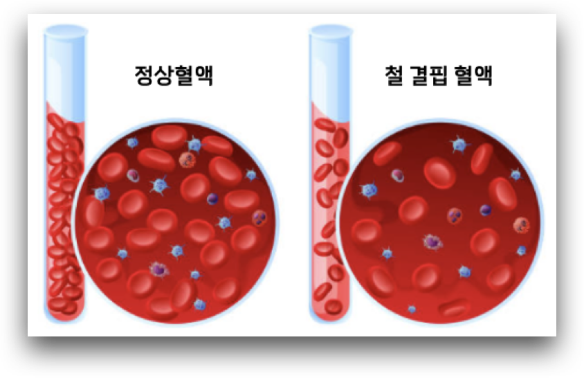 철은 적혈구 내에 있는 혈색소인 헤모글로빈(Hemoglobin)의 가장 중요한 구성 요소입니다. 철 결핍성 빈혈은 인체내 저장된 철의 양이 정상적인 적혈구 생성에 필요한 양보다 감소하여 발생하게 됩니다.